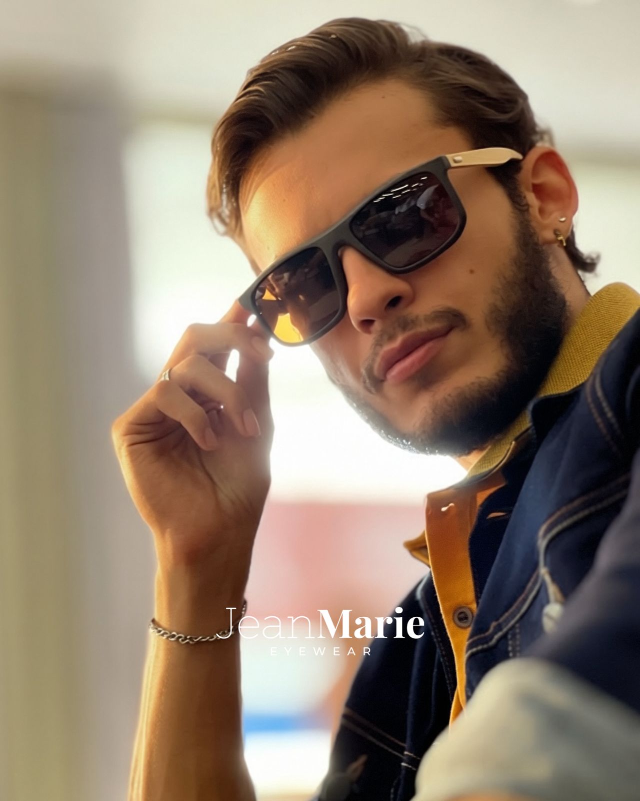 Óculos em acetato, com hastes em bambu, lentes em policarbonato marrom com proteção UV400 e polarização.