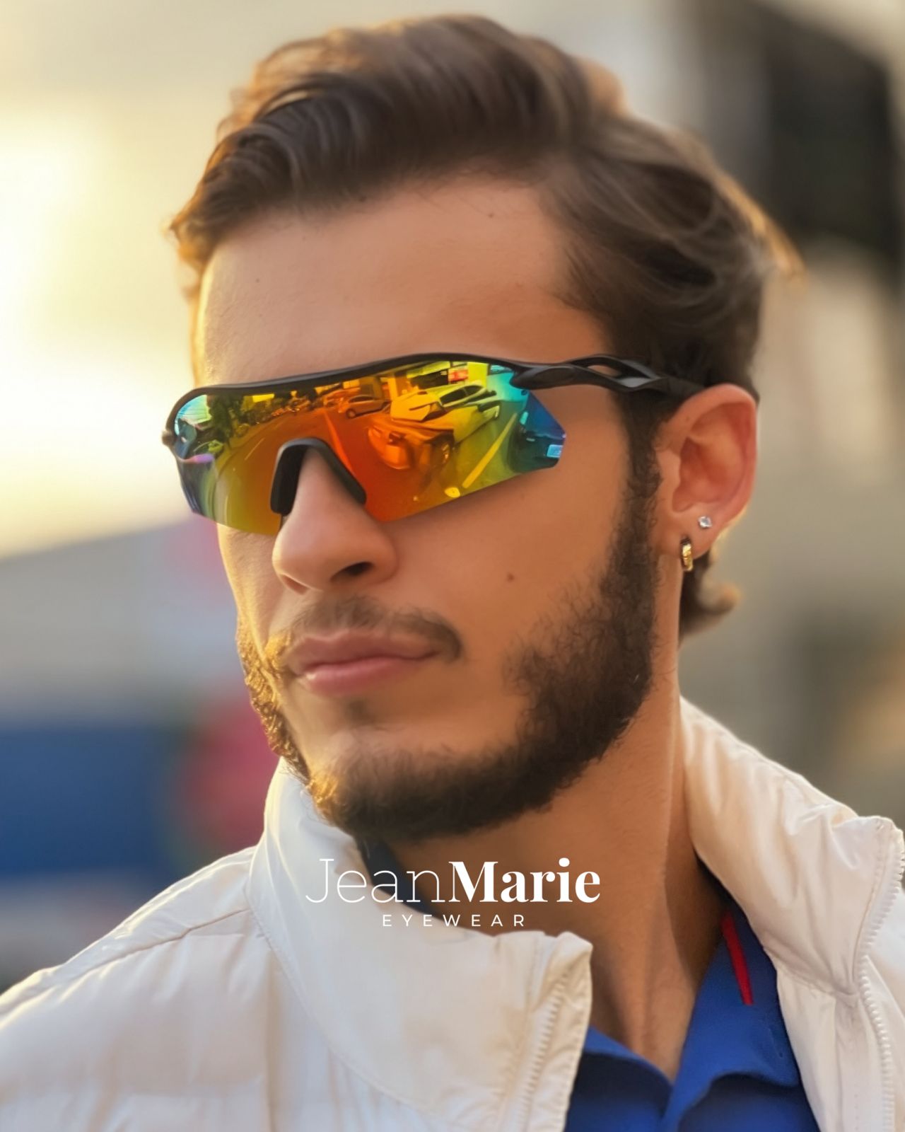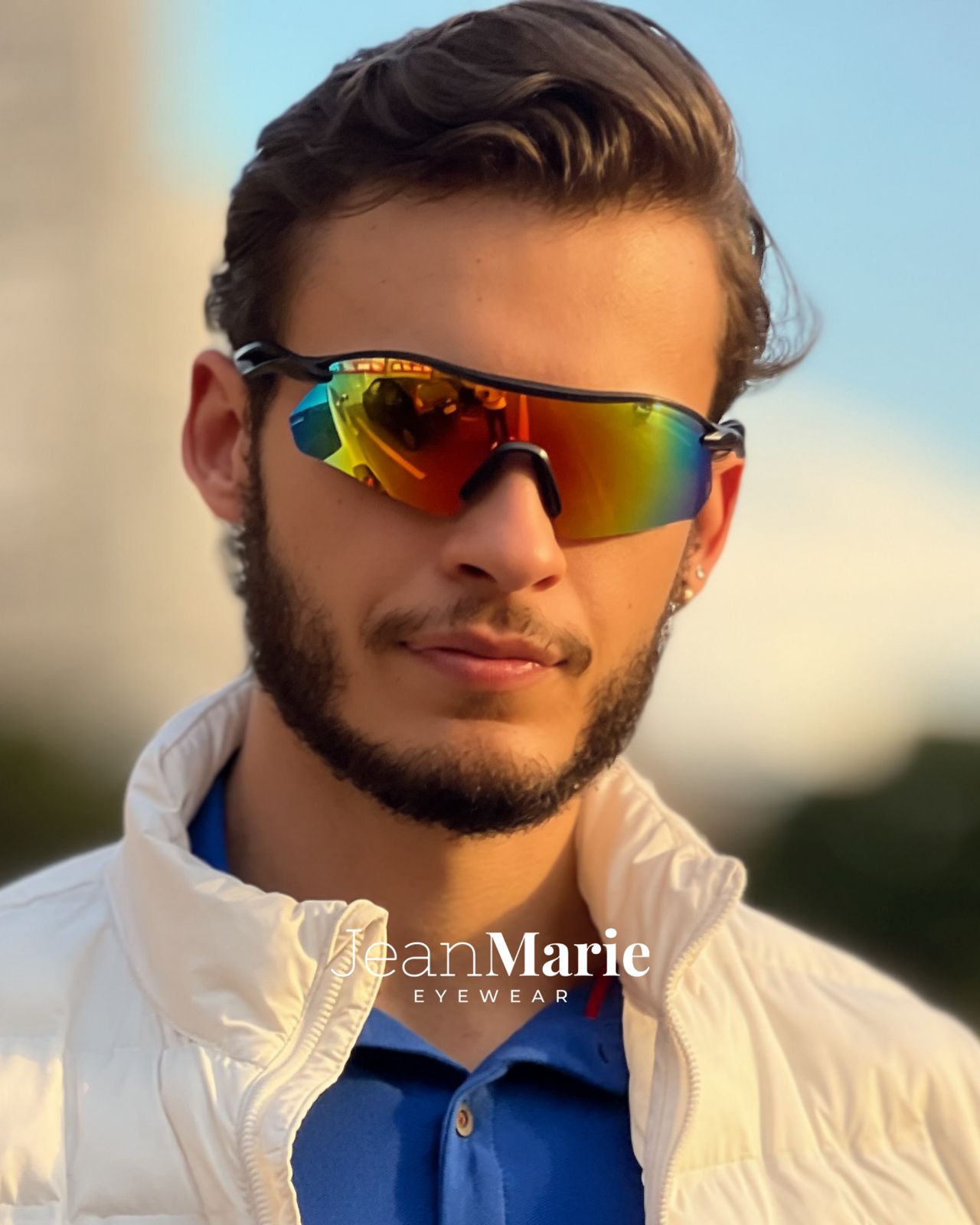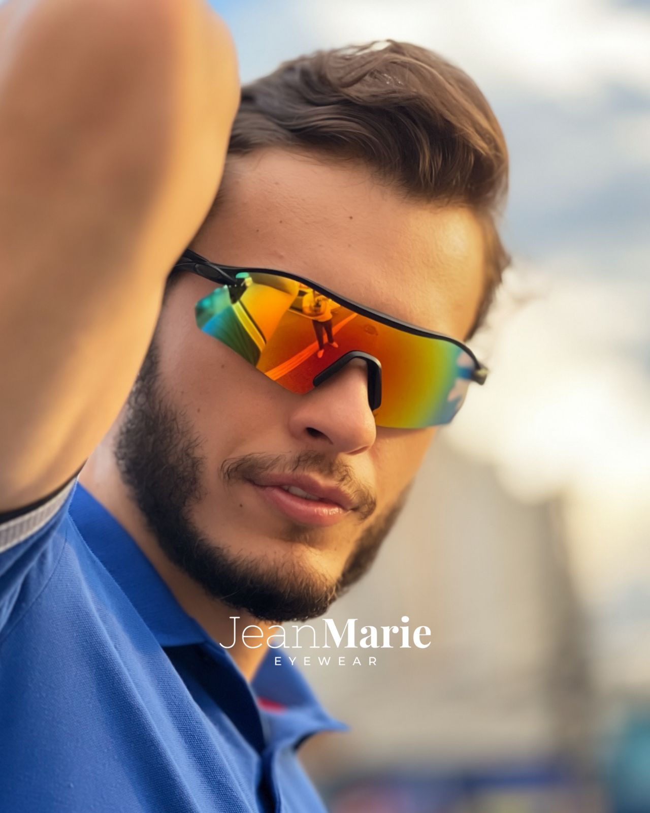 Óculos esportivo em acetato, hastes emborrachadas, lentes em policarbonato com proteção UV400.