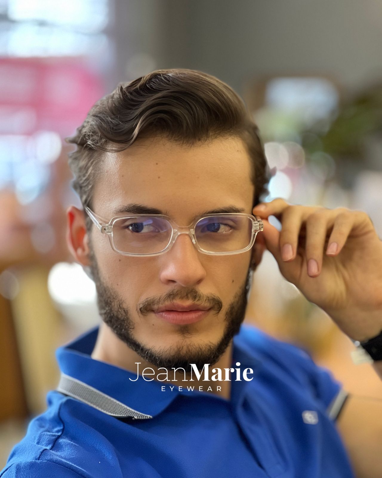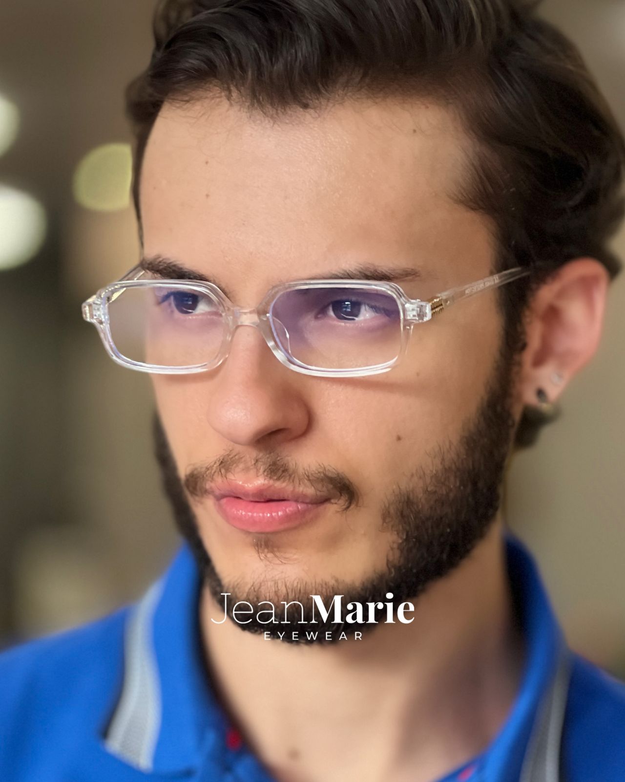 Óculos em acetato translúcido cristal, lentes transparentes com proteção UV400.