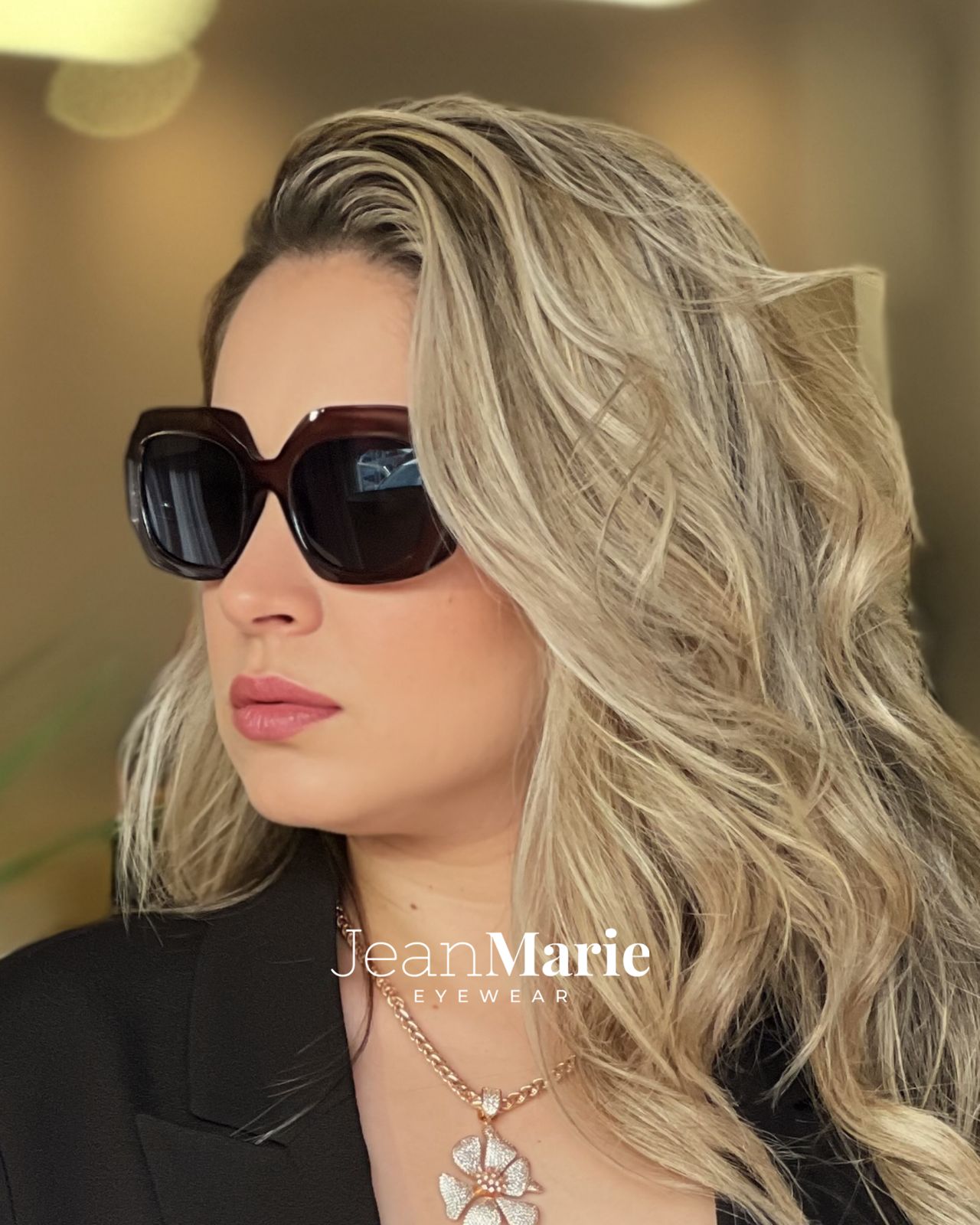 Óculos em acetato premium translúcido cinza, lapidado, lentes preta em policarbonato com proteção UV400.
